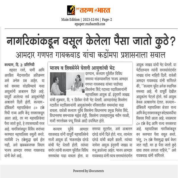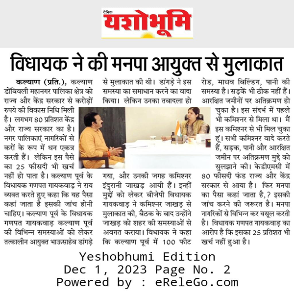 राज्य सरकारने व मा. मुख्यमंत्री नामदार श्री देवेंद्रजी फडणवीस साहेब यांनी मला कल्याण पूर्व विधानसभेच्या विकासासाठी करोडो रुपयांचा निधी उपलब्ध करून दिलेला आहे व या निधीच्या माध्यमातून मी कल्याण पूर्व विधानसभा क्षेत्रामध्ये अनेक लोकोपयोगी विकास कामे केली आहेत व करत आहे शिवाय सामाजिक शैक्षणिक कला क्रीडा व आरोग्य विषयक अनेक उपक्रम यशस्वी करण्यात आले असून माझ्या मतदारसंघाच्या संपूर्ण व सर्वांगीण विकासाकरिता अनेक लोकोपयोगी अशा विकासकामांचे नियोजन सुरू आहे.